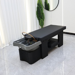 Silla de salón de belleza negra con cuenco para lavar el cabello de cuero sintético, fregadero de masaje de acoplamiento para Spa, champú para lavar el cabello, estilo japonés